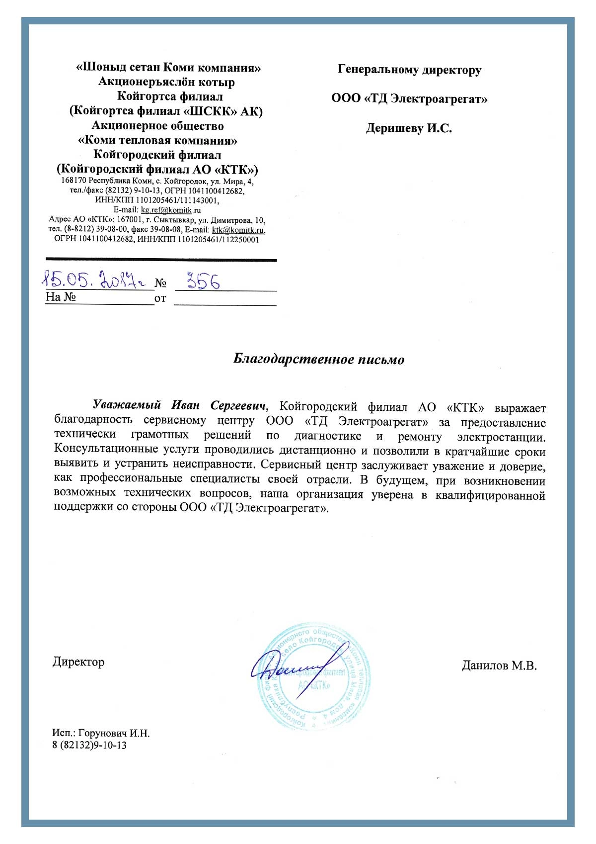 Уважаемый Иван Сергеевич, Койгородский филиал АО "КТК" выражает благодарность сервисному центру ООО «ТД Электроагрегат» за предоставление технически грамотных решений по диагностике и ремонту электростанции.